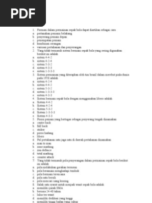 Formasi dalam sepak bola dapat diartikan sebagai cara seroang pelatih meletakkan posisi pemainnya dalam susunan atau strategi untuk memainkan permainan sepak bola di tim mereka. Pada gerakan lari menggunakan kaki bagiana tengahb. Dalam permainan sepak bola, untuk mengoperkan bola kepada teman dalam jarak dekat menggunakan. Permainan sepak bola telah lama menjadi salah satu olahraga paling populer di dunia. Hal ini kerana benteng pertahanan boleh terdedah jika tiada tumpuan tinggi diberikan. Pendaratan kaki yang benar saat melakukan lompat tali untuk melatih kelincahan otot kaki adalah. Penyebabnya adalah libero tidak efektif digunakan dalam sepakbola modern karena banyak tim menggunkan penyerang tunggal. Biasanya kaki ini adalah kaki dominan, yaitu kaki yang berhubungan dengan tangan yang sering dipakai (jika anda kidal, artinya kaki dominan adalah kaki kiri, dst.) Selain mengharuska pemainnya menguasai teknik dasar ternyata permainan ini juga memerlukan strategi. Bek adalah pemain yang berada di depan kiper sebagai pertahanan apabila bola lolos ke kotak penalti. Pada formasi ini, yang digunakan adalah 4 pemain belakang atau bek, 4 pemain tengah dan. Teknik yang digunakan dalam sepak bola untuk melakukan operan jarak jauh adalah. Ijin bantu, sistem bermainan sepak bola dengan menggunakan libero adalah pormasi: